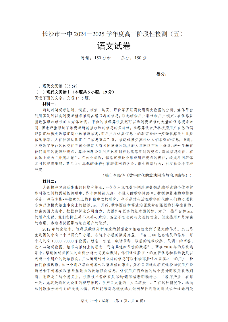 湖南省长沙市第一中学2025届高三上学期阶段性检测(五)语文