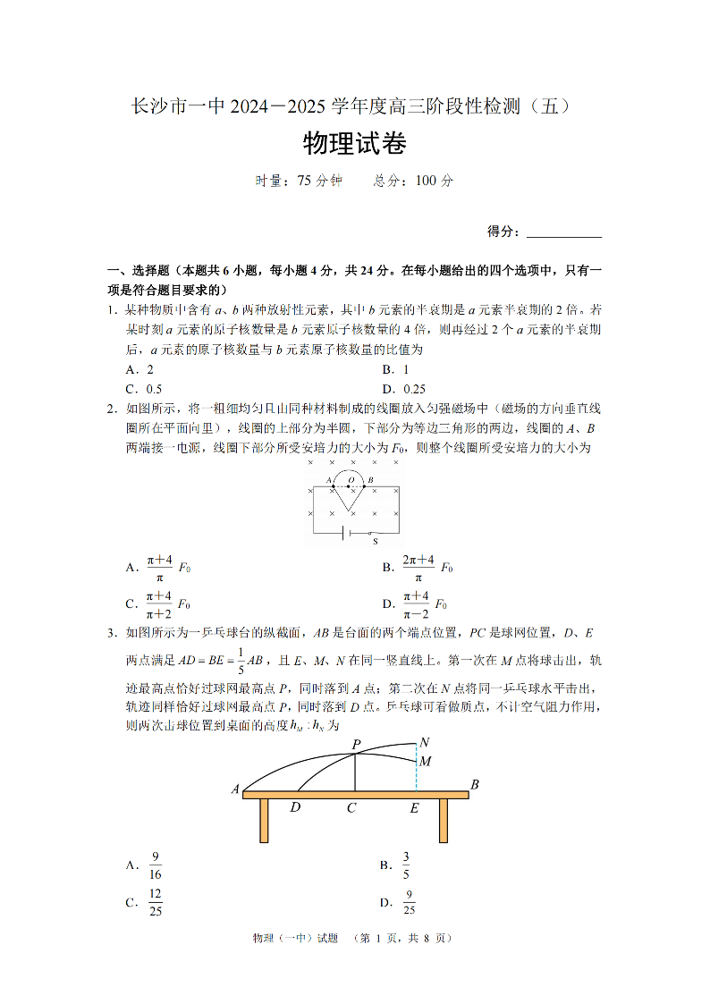 湖南省长沙市第一中学2025届高三上学期阶段性检测(五)物理