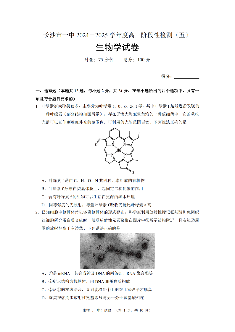 湖南省长沙市第一中学2025届高三上学期阶段性检测(五)生物