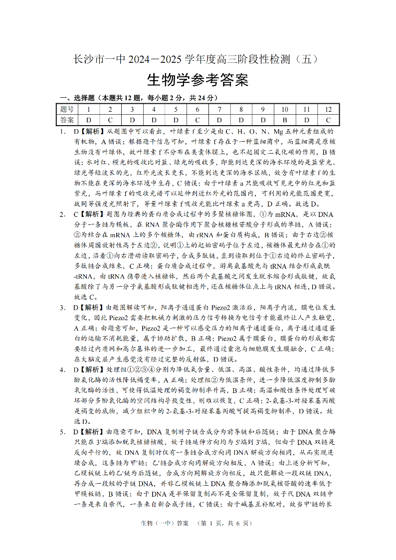 湖南省长沙市第一中学2025届高三上学期阶段性检测(五)生物答案