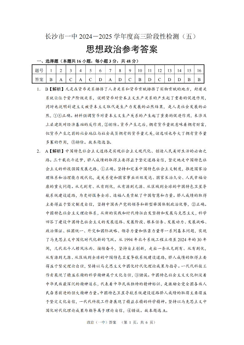 湖南省长沙市第一中学2025届高三上学期阶段性检测(五)政治答案