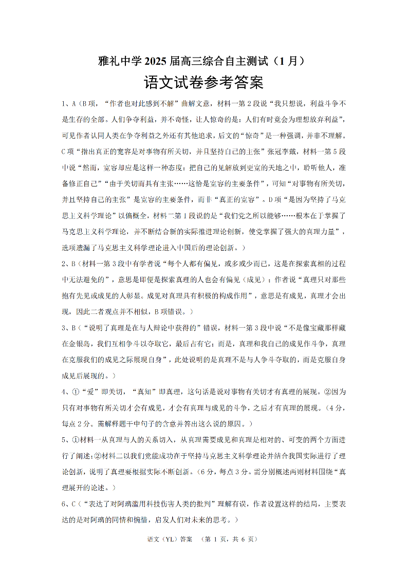 湖南省雅礼中学2025届高三上学期1月综合自主测试(期末)语文答案