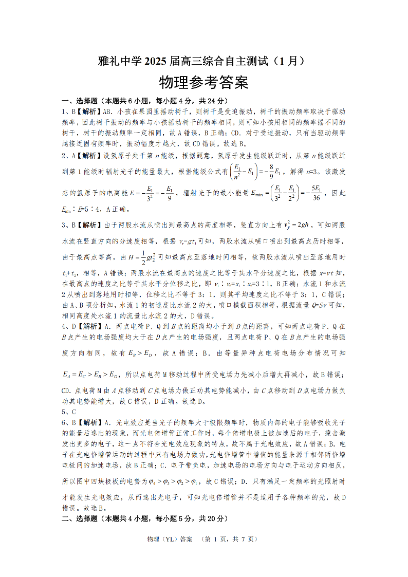 湖南省雅礼中学2025届高三上学期1月综合自主测试(期末)物理答案