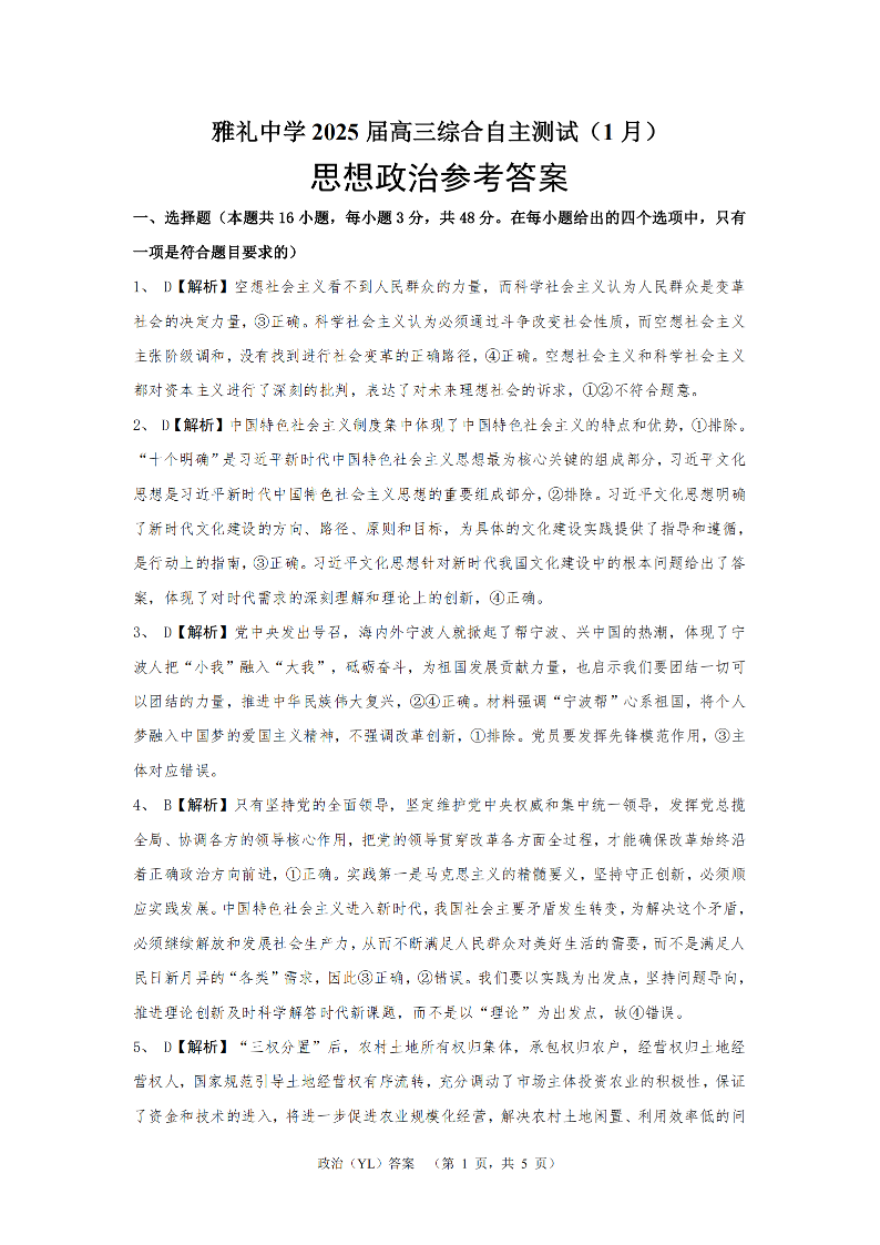 湖南省雅礼中学2025届高三上学期1月综合自主测试(期末)政治答案