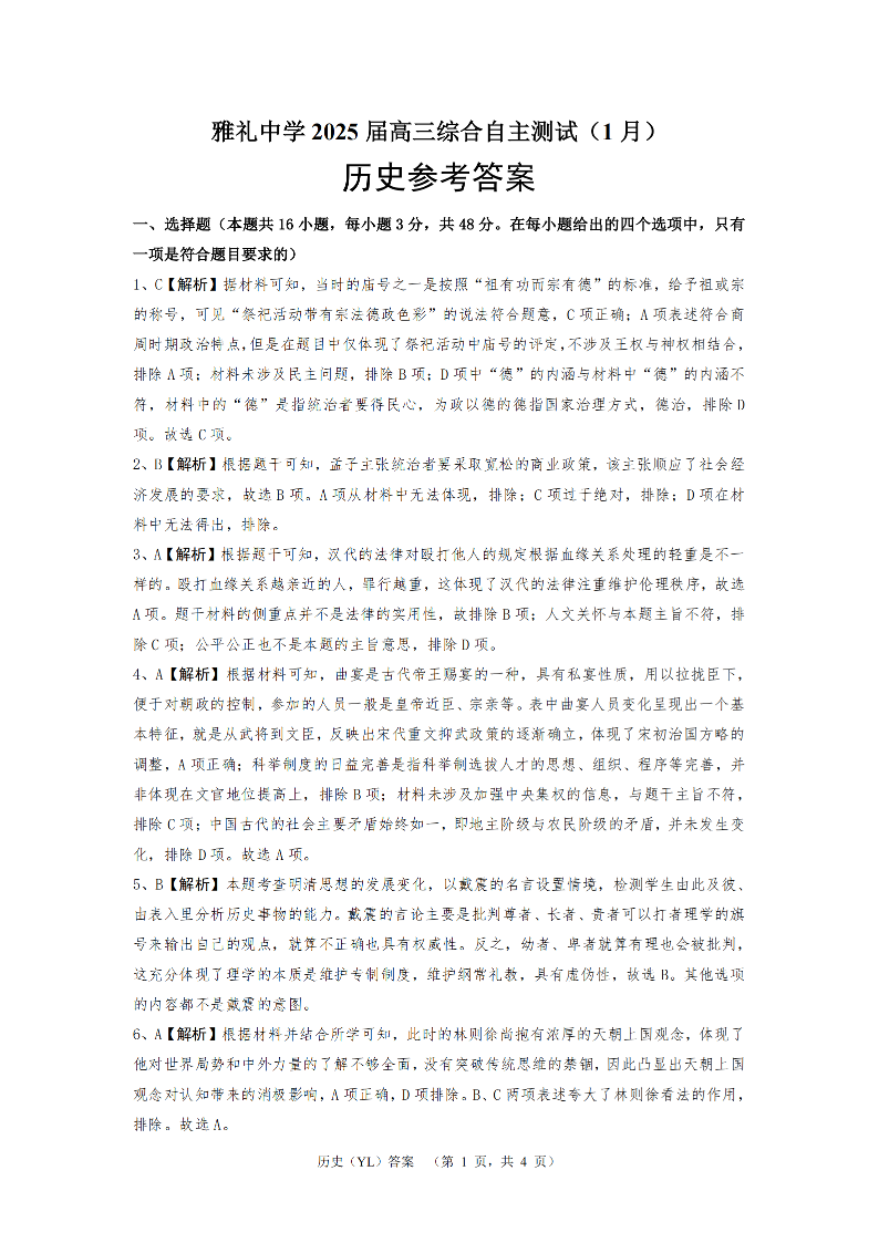 湖南省雅礼中学2025届高三上学期1月综合自主测试(期末)历史答案