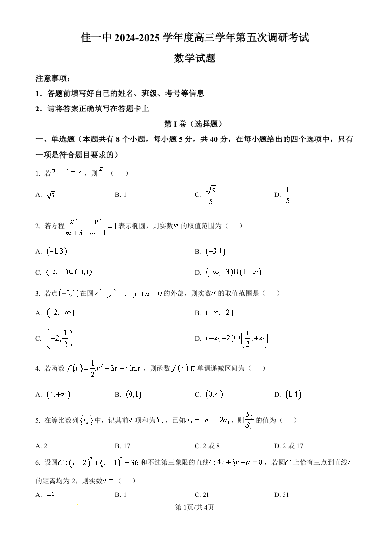 黑龙江省佳木斯市第一中学2025届高三上学期第五次调研考试数学(原卷版)