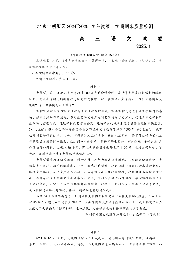 北京市朝阳区2025届高三上学期1月期末考试语文+答案