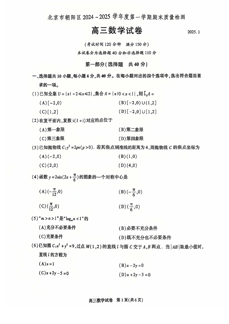 北京市朝阳区2025届高三上学期1月期末考试数学+答案
