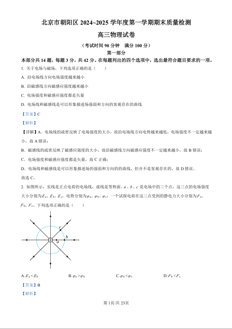 北京市朝阳区2025届高三上学期1月期末考试物理(精品解析版)