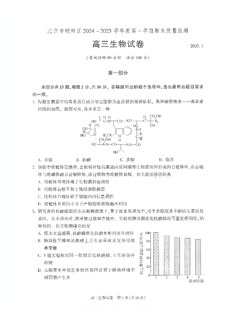 北京市朝阳区2025届高三上学期1月期末考试生物