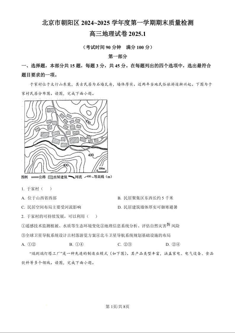 北京市朝阳区2025届高三上学期1月期末考试地理(原卷版)