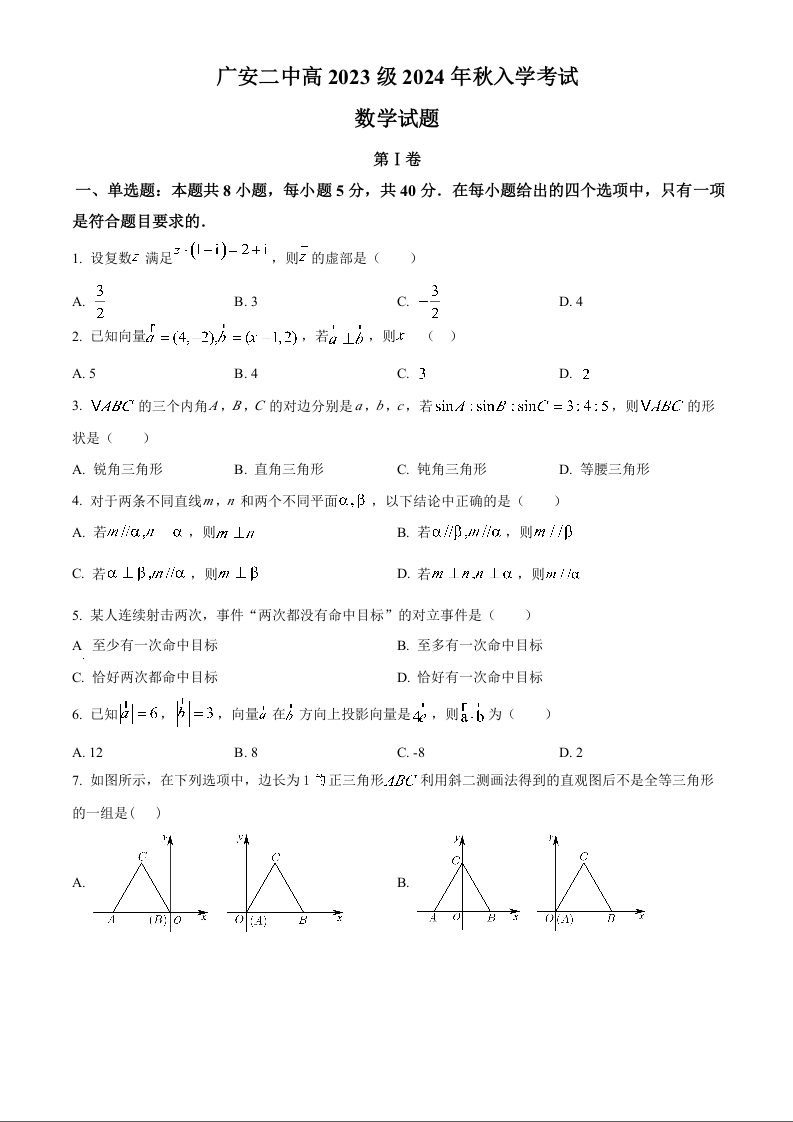 四川省广安市第二中学2024-2025学年高二上学期开学考试数学(原卷版)