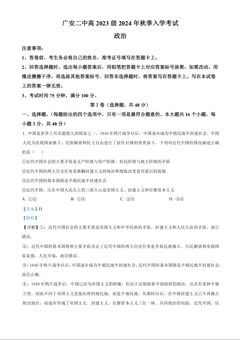 四川省广安市第二中学2024-2025学年高二上学期开学考试政治(解析版)