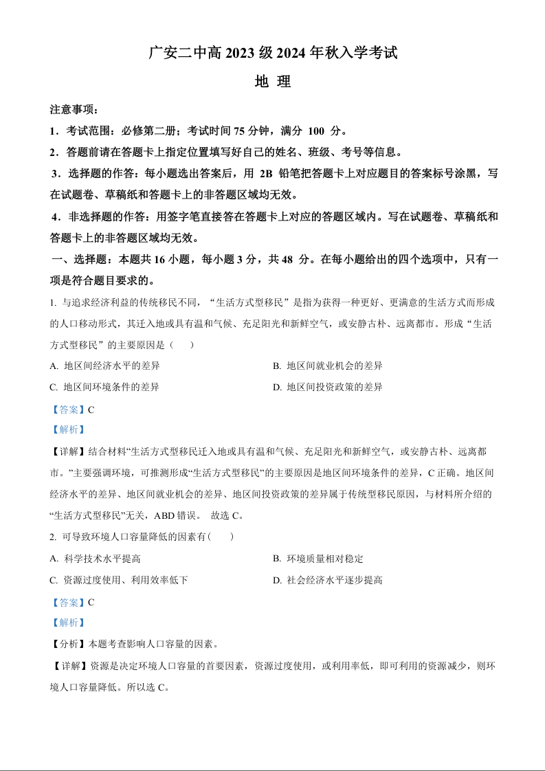 四川省广安市第二中学2024-2025学年高二上学期开学考试地理(解析版)