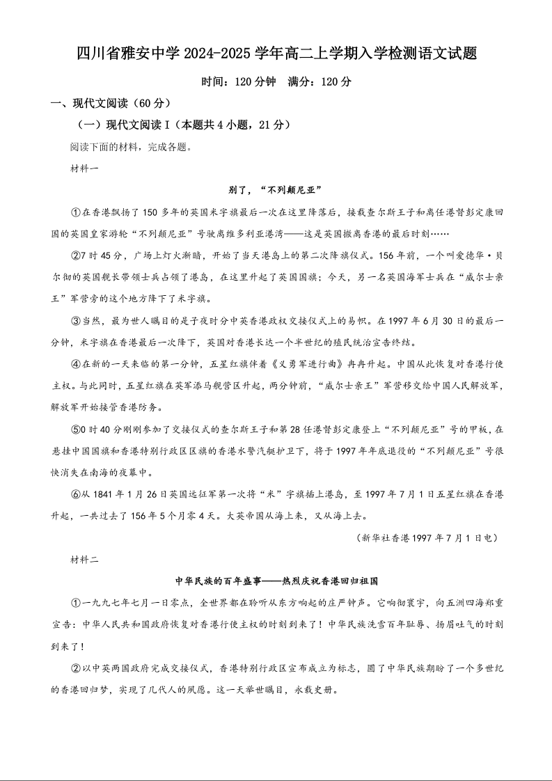 四川省雅安市雅安中学2024-2025学年高二上学期入学检测语文(原卷版)