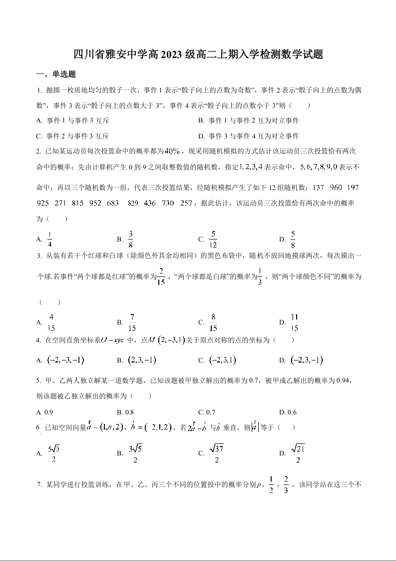 四川省雅安市雅安中学2024-2025学年高二上学期入学检测数学(原卷版)