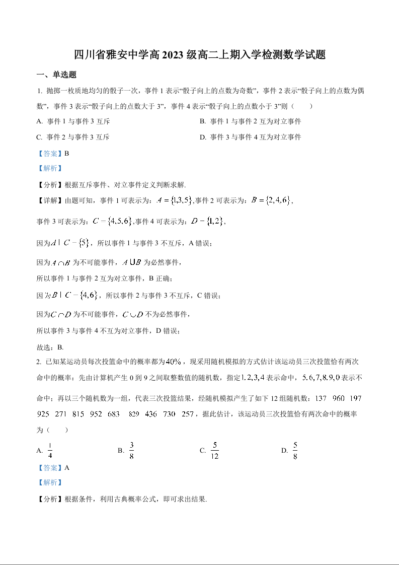 四川省雅安市雅安中学2024-2025学年高二上学期入学检测数学(解析版)