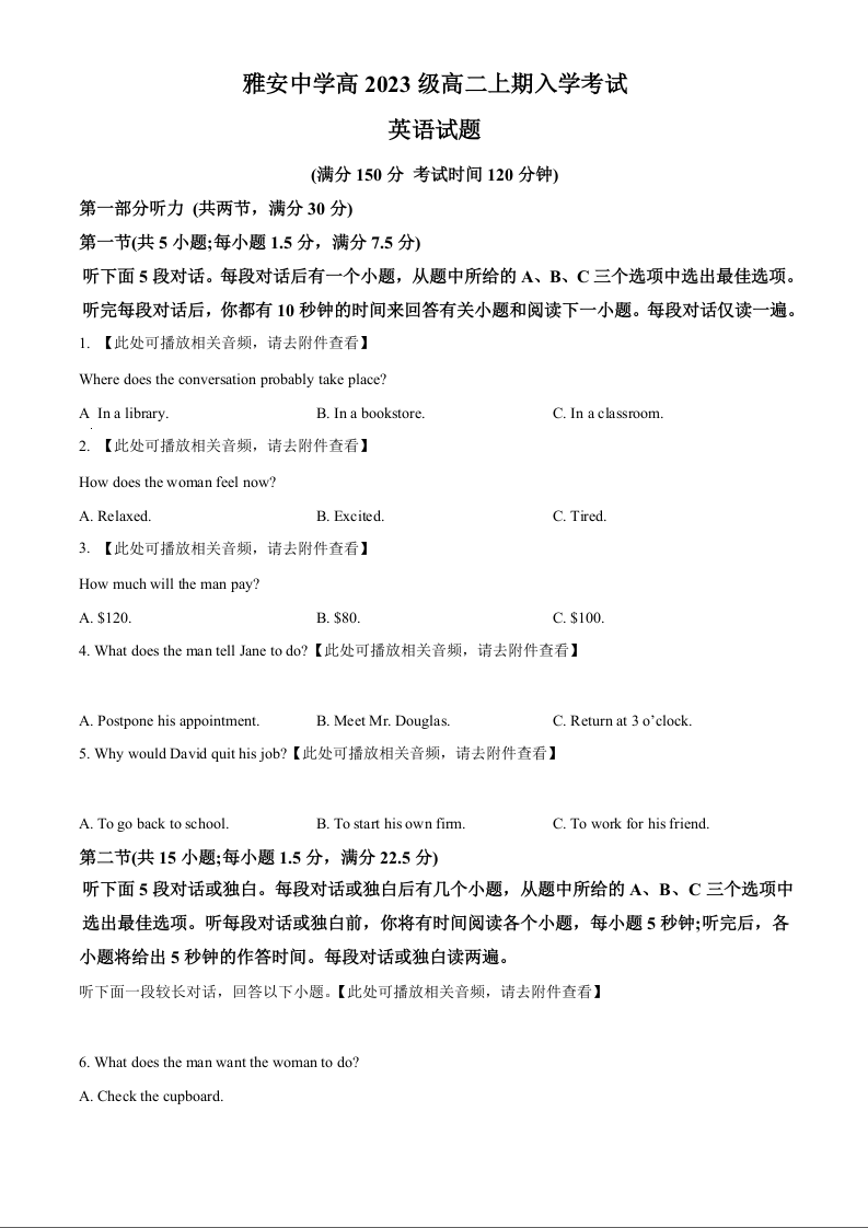 四川省雅安市雅安中学2024-2025学年高二上学期入学检测英语(原卷版)