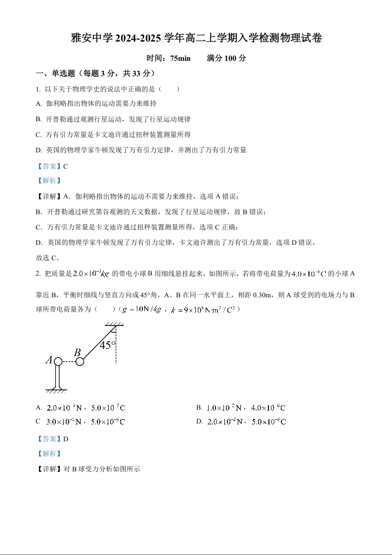 四川省雅安市雅安中学2024-2025学年高二上学期入学检测物理(解析版)