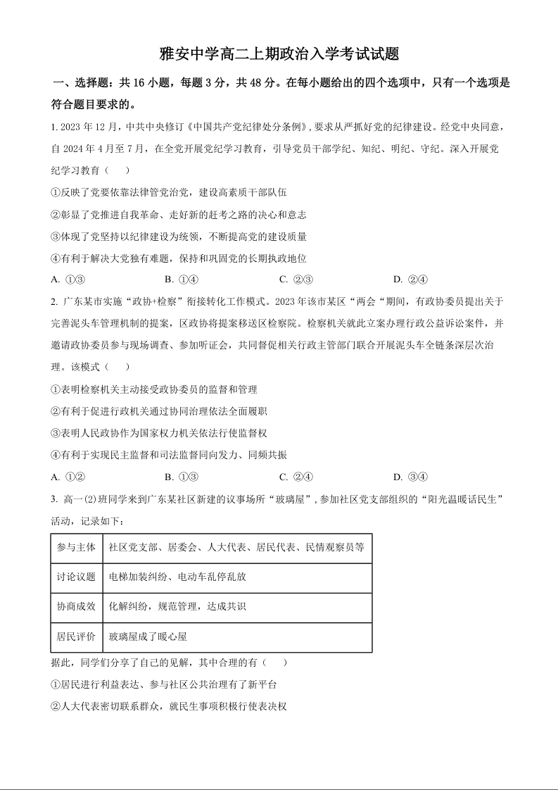 四川省雅安市雅安中学2024-2025学年高二上学期入学检测政治(原卷版)