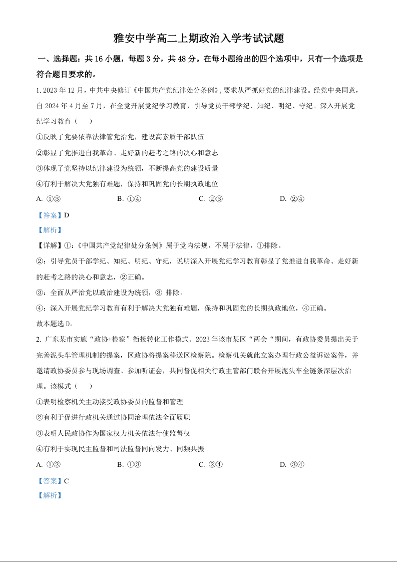四川省雅安市雅安中学2024-2025学年高二上学期入学检测政治(解析版)