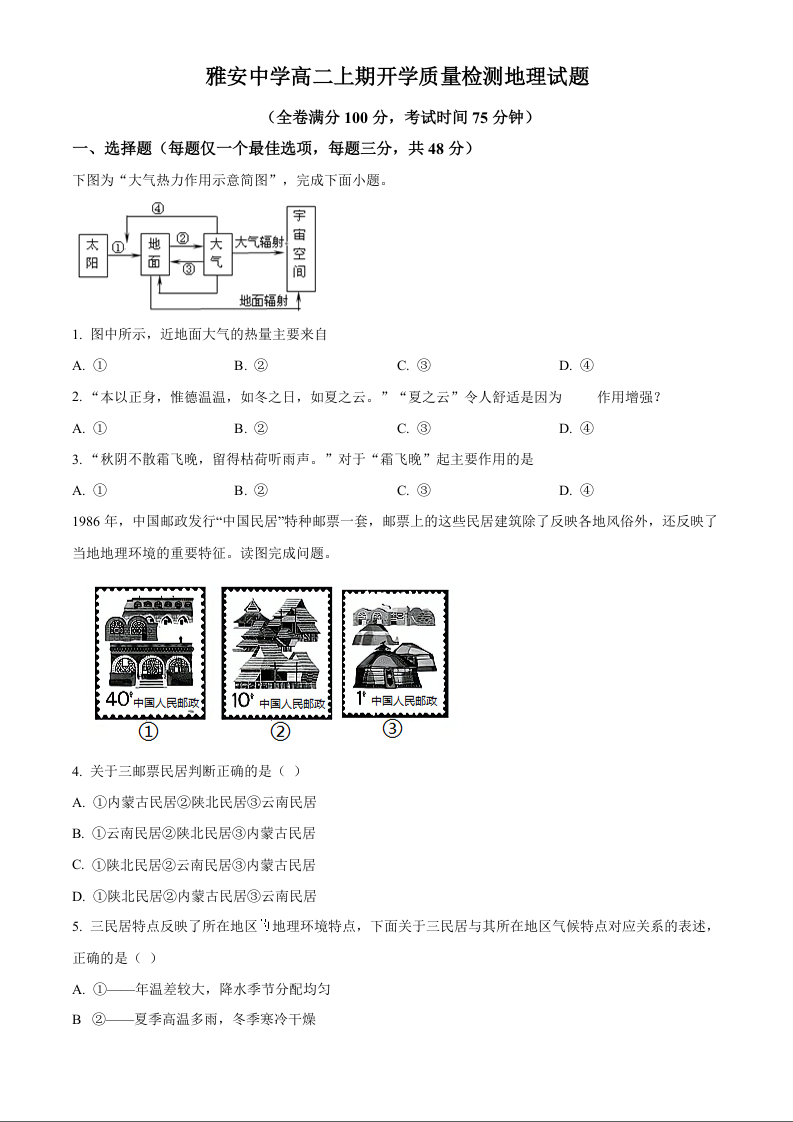 四川省雅安市雅安中学2024-2025学年高二上学期入学检测地理(原卷版)