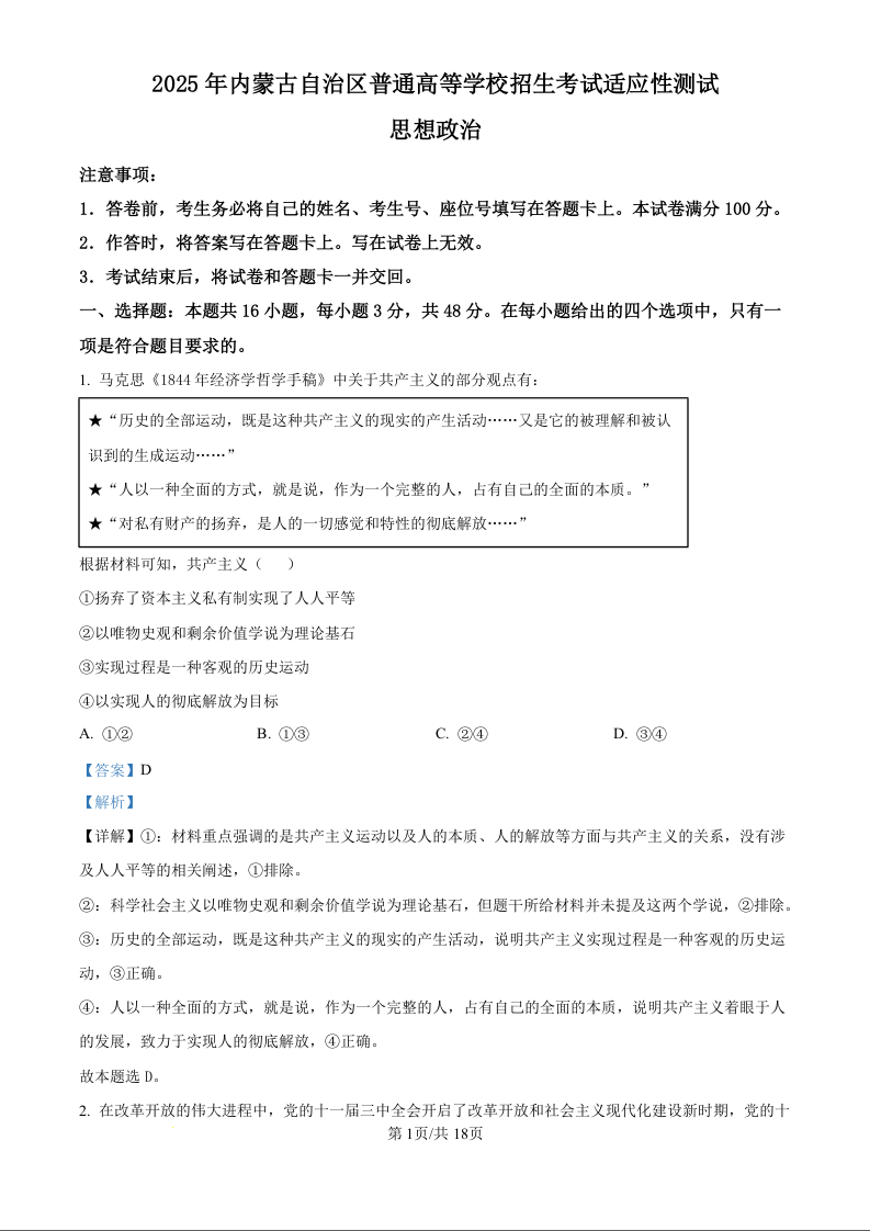 新八省联考2025年内蒙古高考综合改革适应性演练政治(精品解析版)