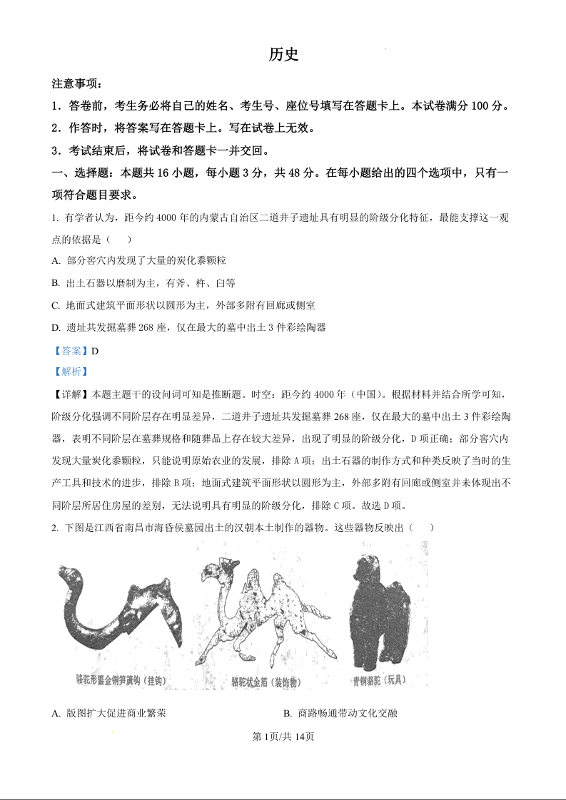 新八省联考2025年内蒙古高考综合改革适应性演练历史(精品解析版)