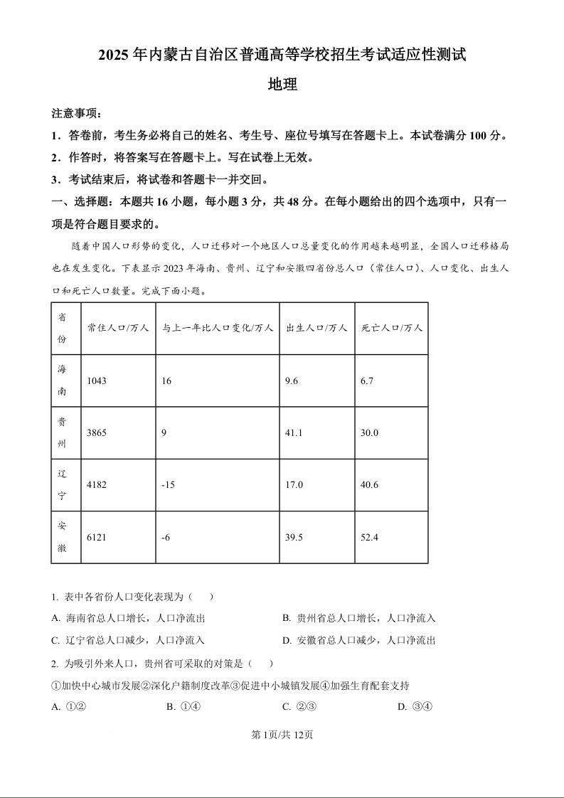 新八省联考2025年内蒙古高考综合改革适应性演练地理(精品解析版)
