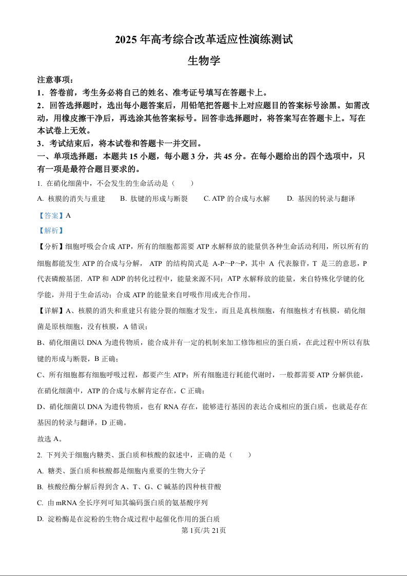 【四川卷】新八省联考2025年内蒙古高考综合改革适应性演练生物(精品解析版)