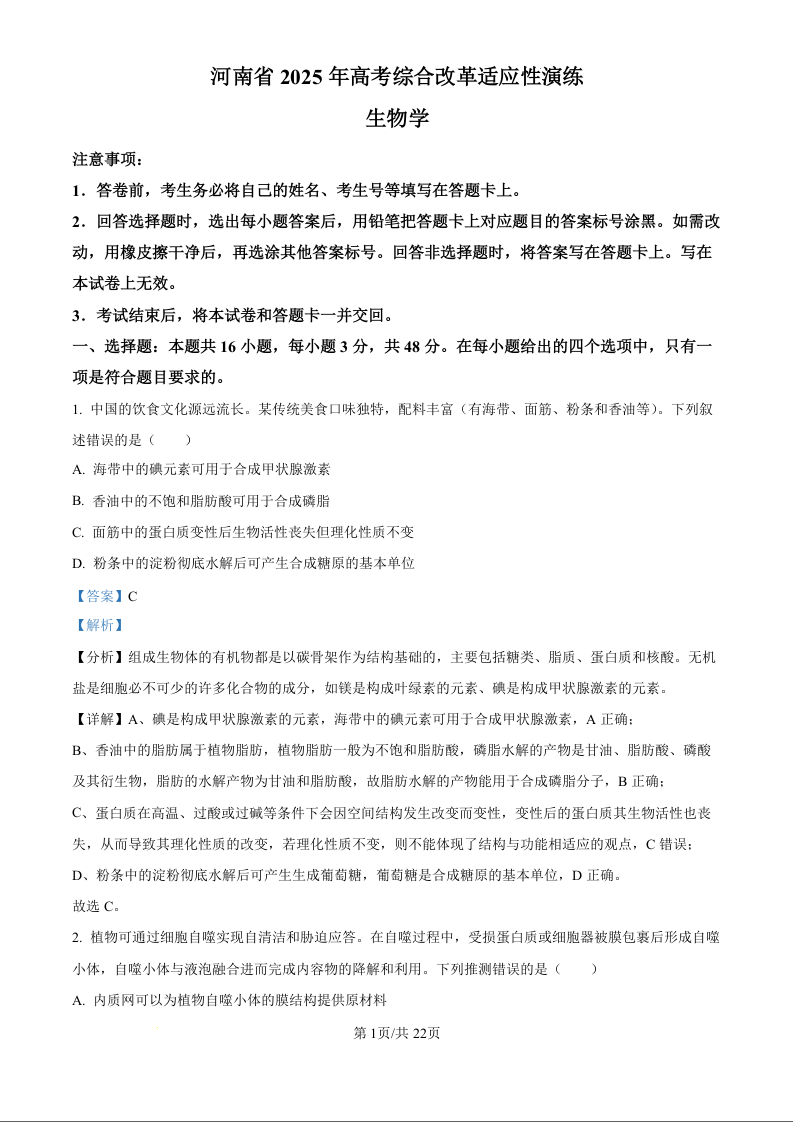 【河南卷】新八省联考2025年内蒙古高考综合改革适应性演练生物(精品解析版)
