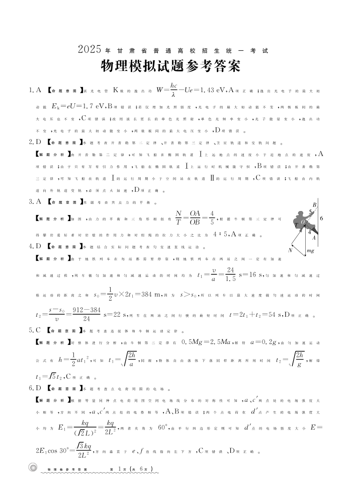 甘肃省白银市部分学校2025届高三上学期1月期末考试物理答案