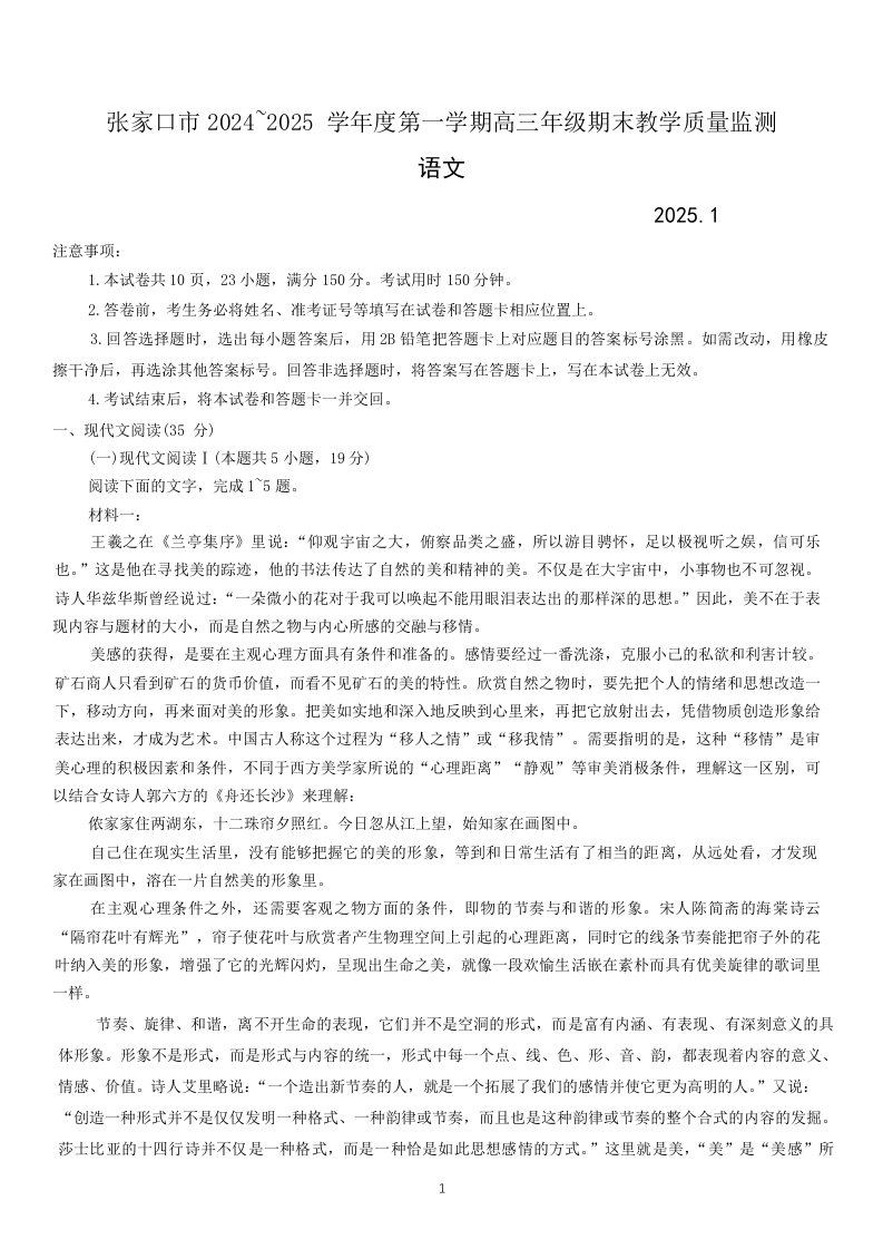 河北省张家口市 2025届高三年级第一学期1月期末教学质量监测语文