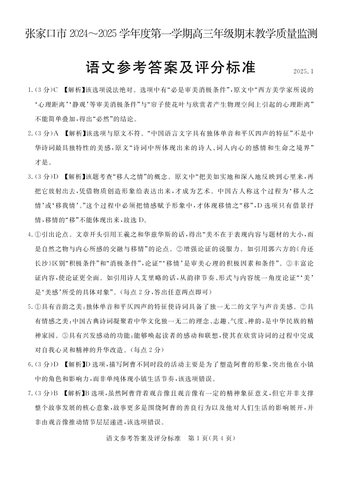 河北省张家口市 2025届高三年级第一学期1月期末教学质量监测语文答案