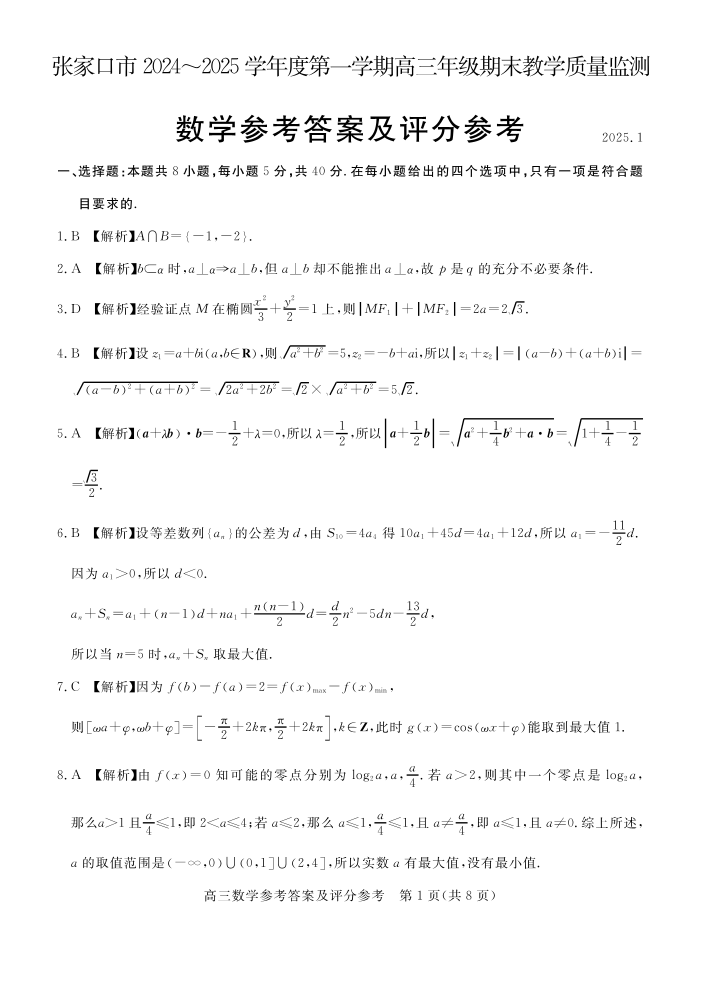 河北省张家口市 2025届高三年级第一学期1月期末教学质量监测数学答案