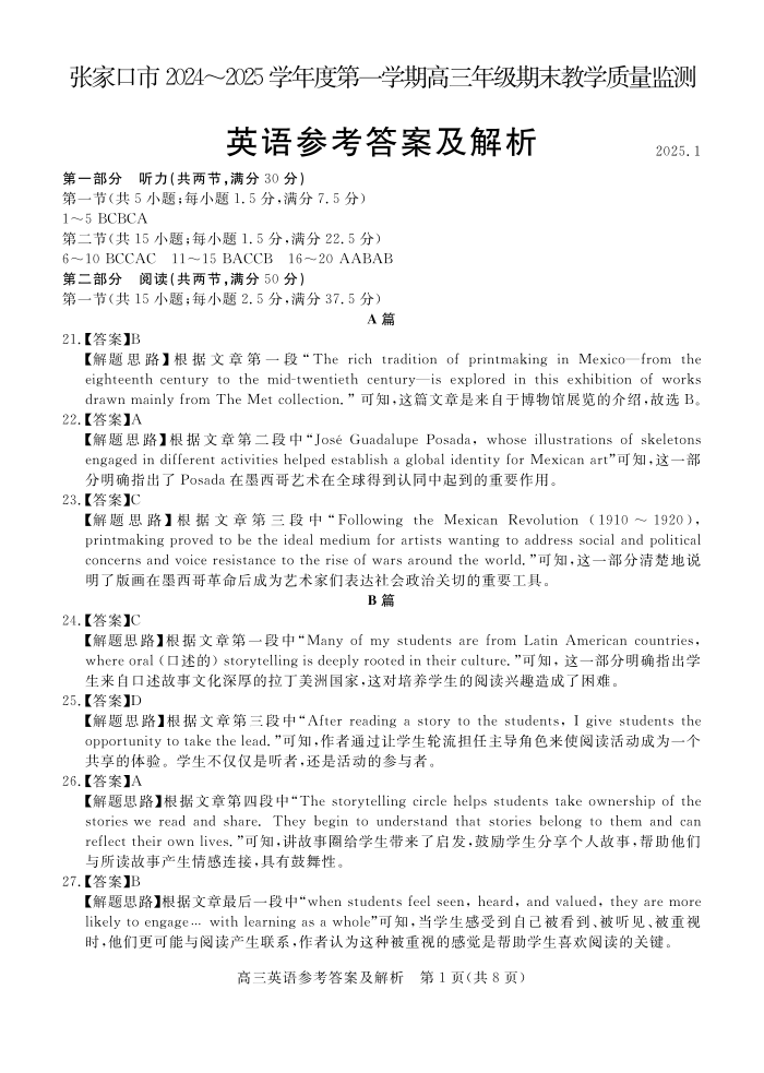 河北省张家口市 2025届高三年级第一学期1月期末教学质量监测英语答案