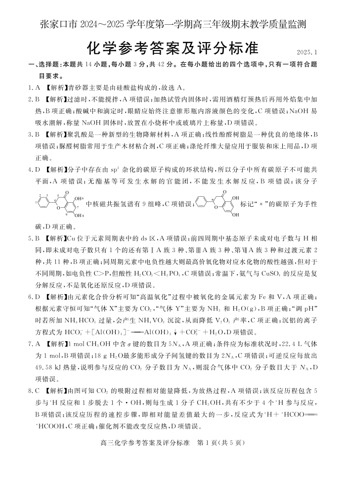 河北省张家口市 2025届高三年级第一学期1月期末教学质量监测化学答案