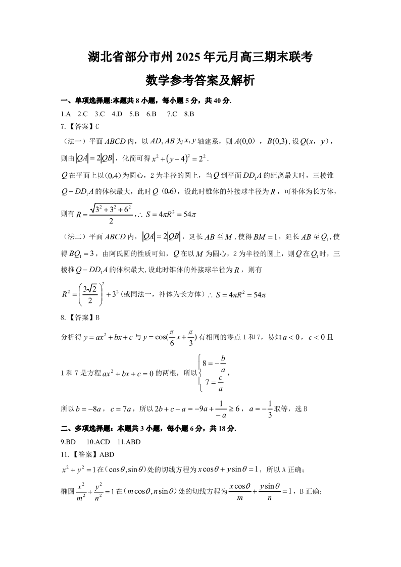 湖北省部分市州元月2025届高三期末联考数学答案