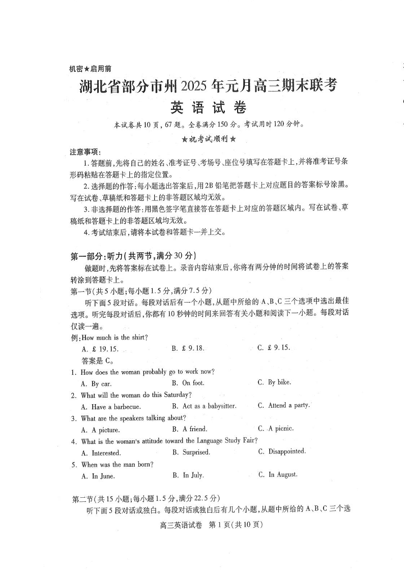 湖北省部分市州元月2025届高三期末联考英语