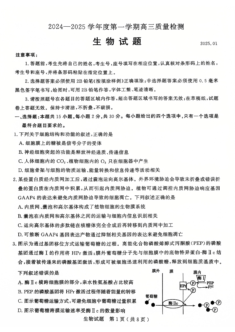 山东省济宁市2025届高三第一学期1月期末质量检测生物