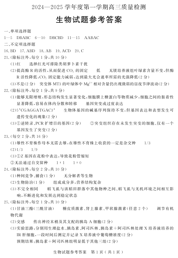 山东省济宁市2025届高三第一学期1月期末质量检测生物答案