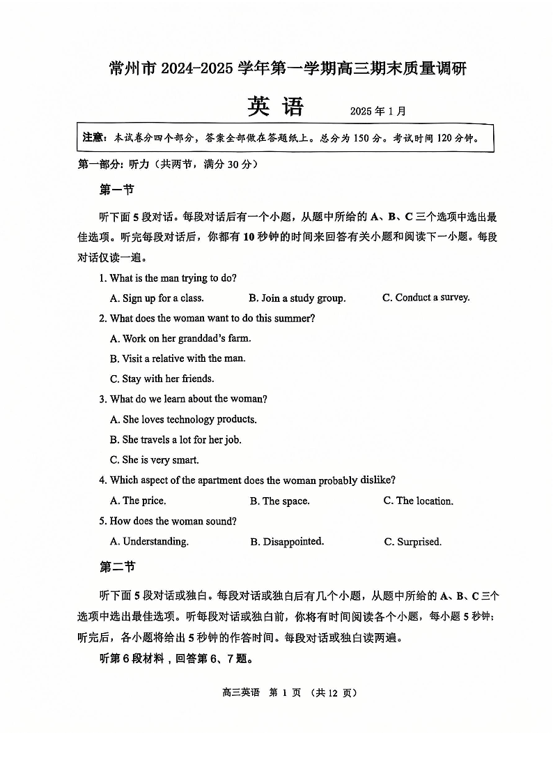 江苏省常州市 2025届高三第一学期1月期末质量调研英语+答案
