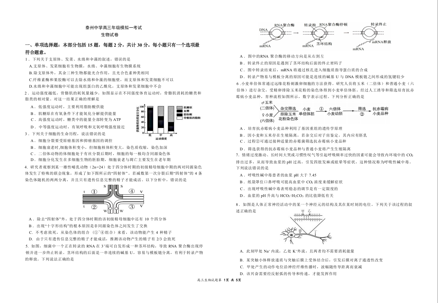 江苏省泰州中学2025届高三上学期一模考试生物+答案