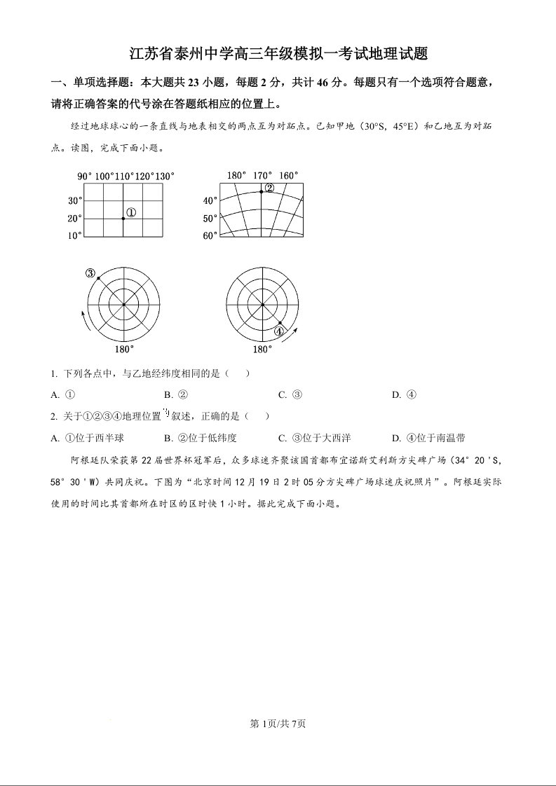 江苏省泰州中学2025届高三上学期一模考试地理(原卷版)