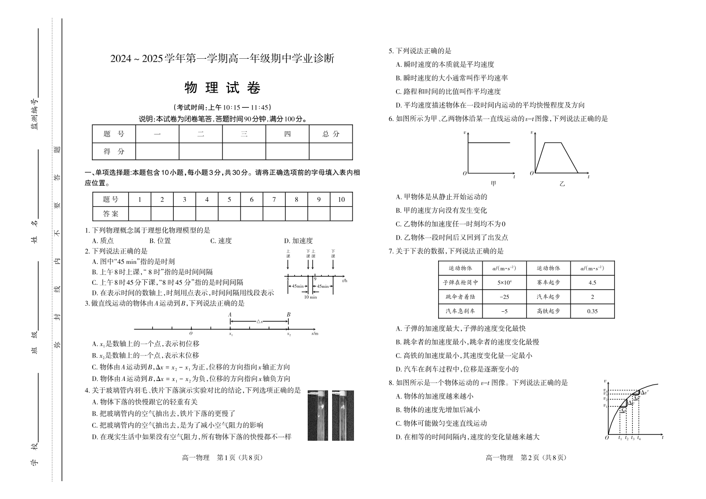 山西省太原市2024-2025学年高一上学期11月期中考试物理