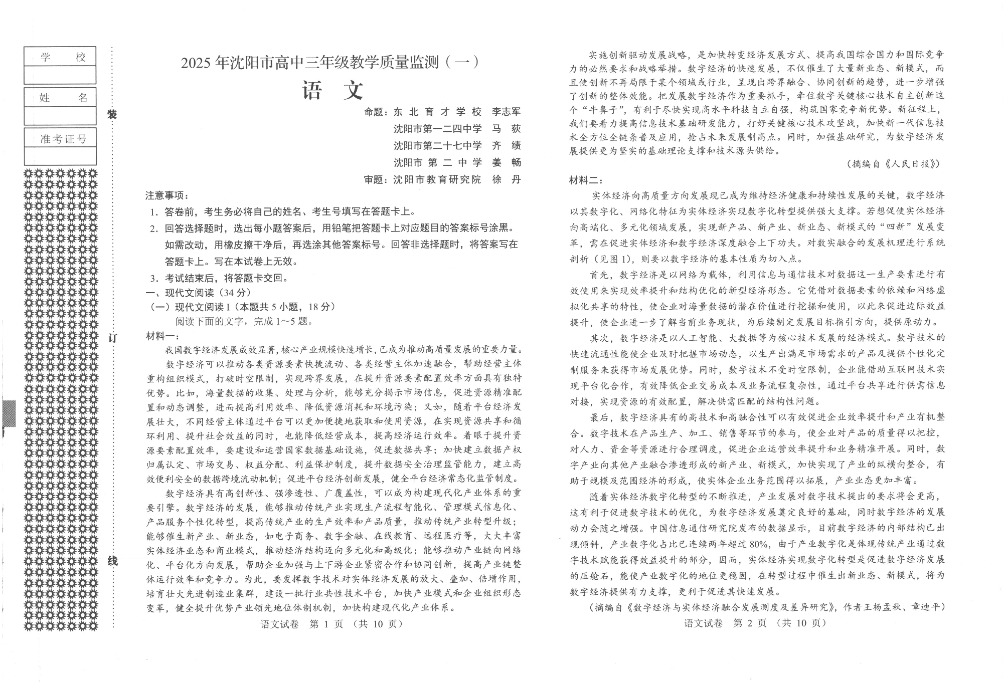 辽宁省沈阳市2025年高中三年级教学质量监测(一模)语文