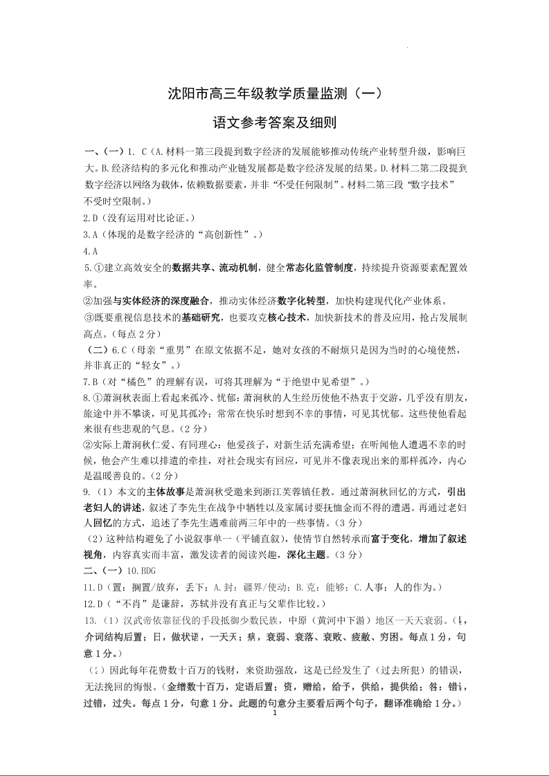 辽宁省沈阳市2025年高中三年级教学质量监测(一模)语文答案