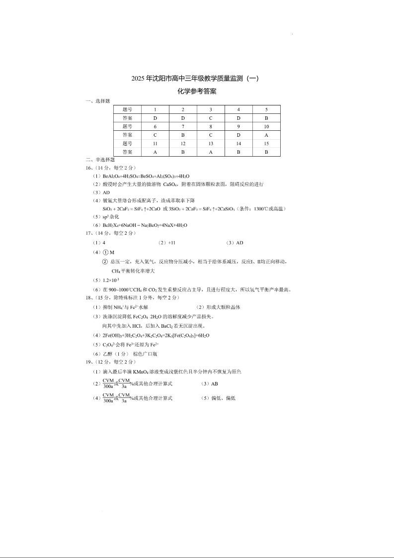辽宁省沈阳市2025年高中三年级教学质量监测(一模)化学答案