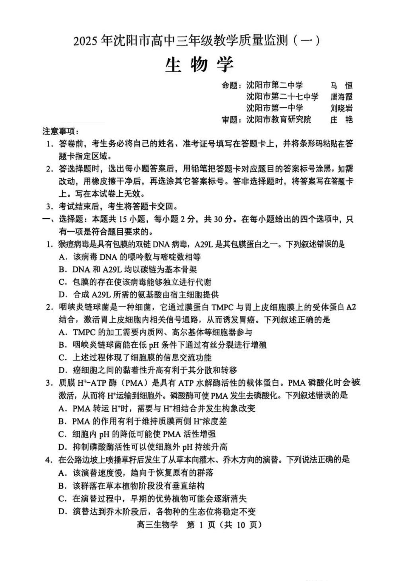 辽宁省沈阳市2025年高中三年级教学质量监测(一模)生物