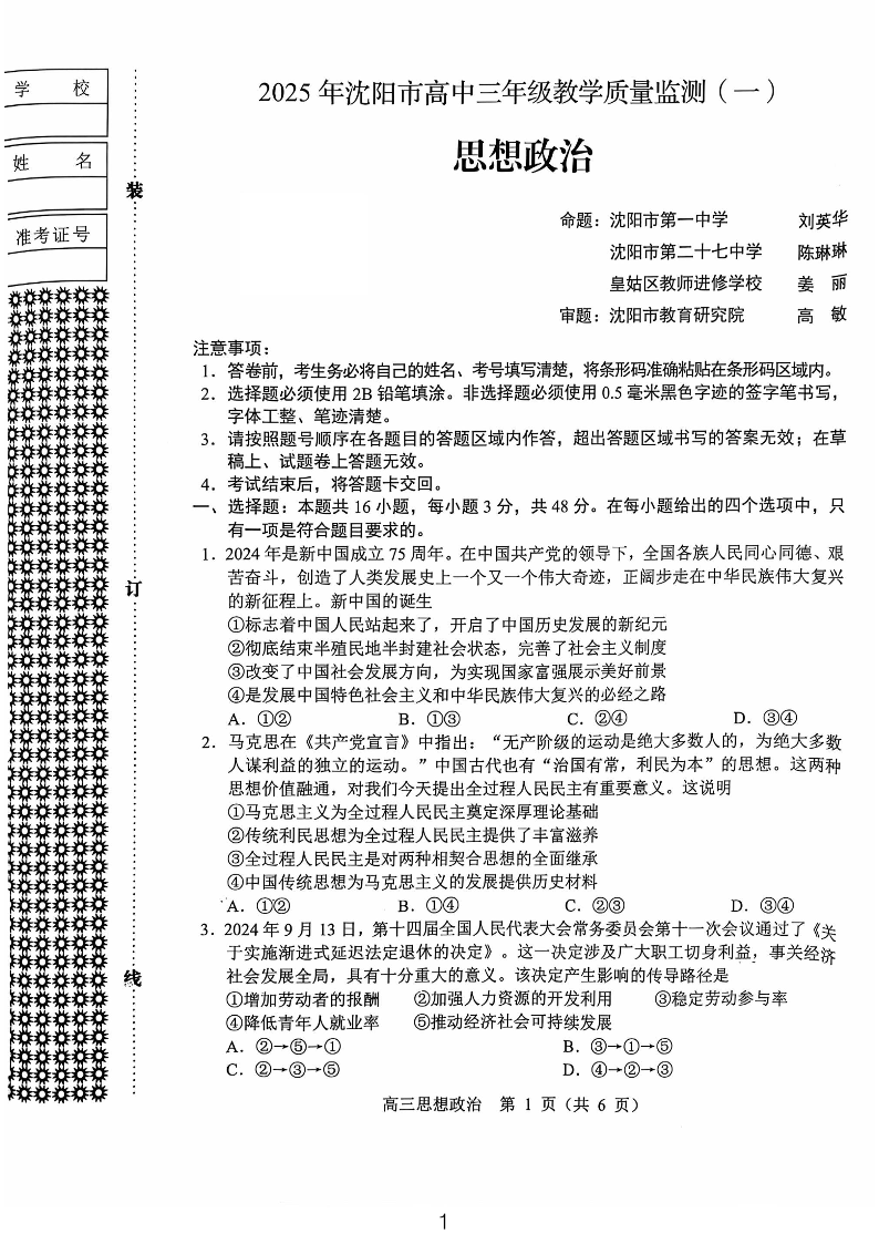 辽宁省沈阳市2025年高中三年级教学质量监测(一模)政治